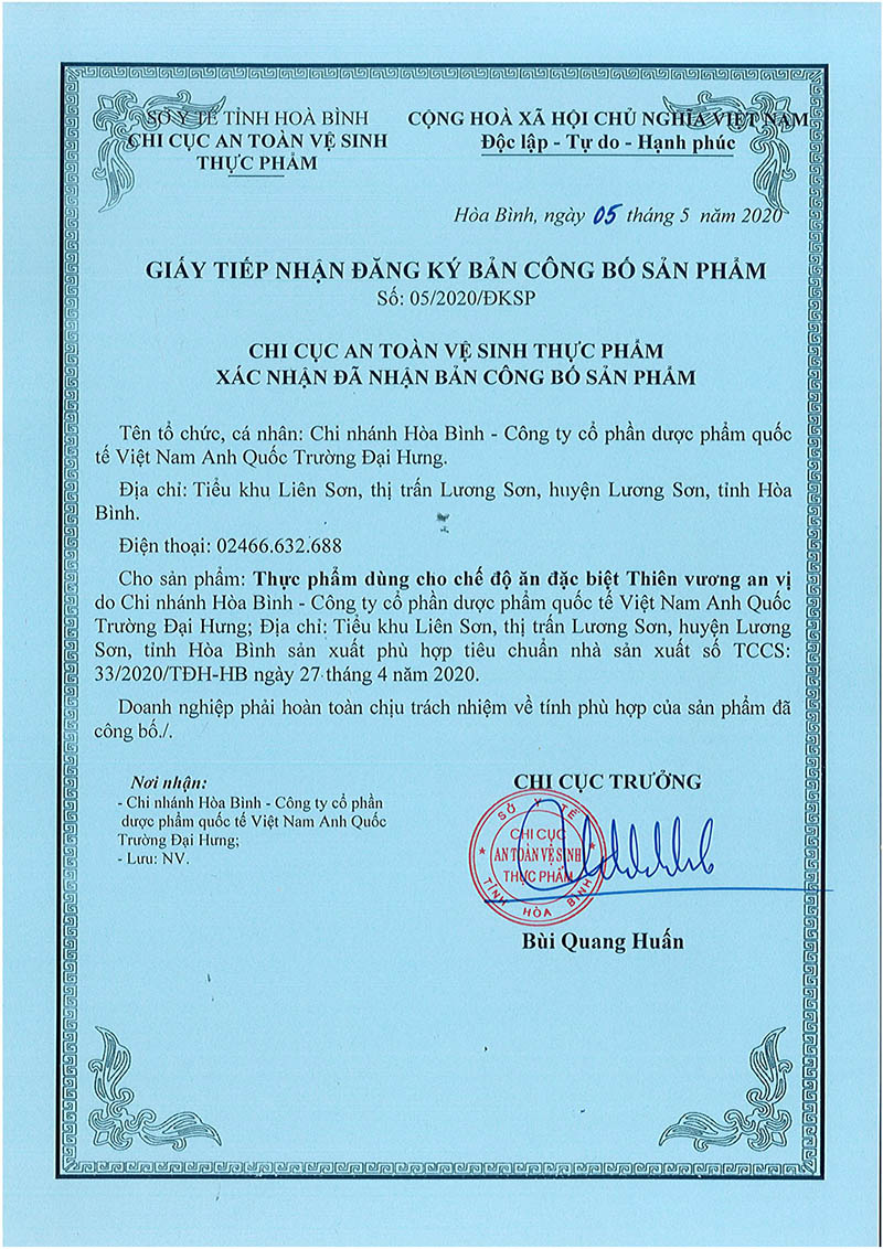 Hình ảnh: Giấy chứng nhận công bố sản phẩm Siro ăn ngon Thiên Vương An Vị