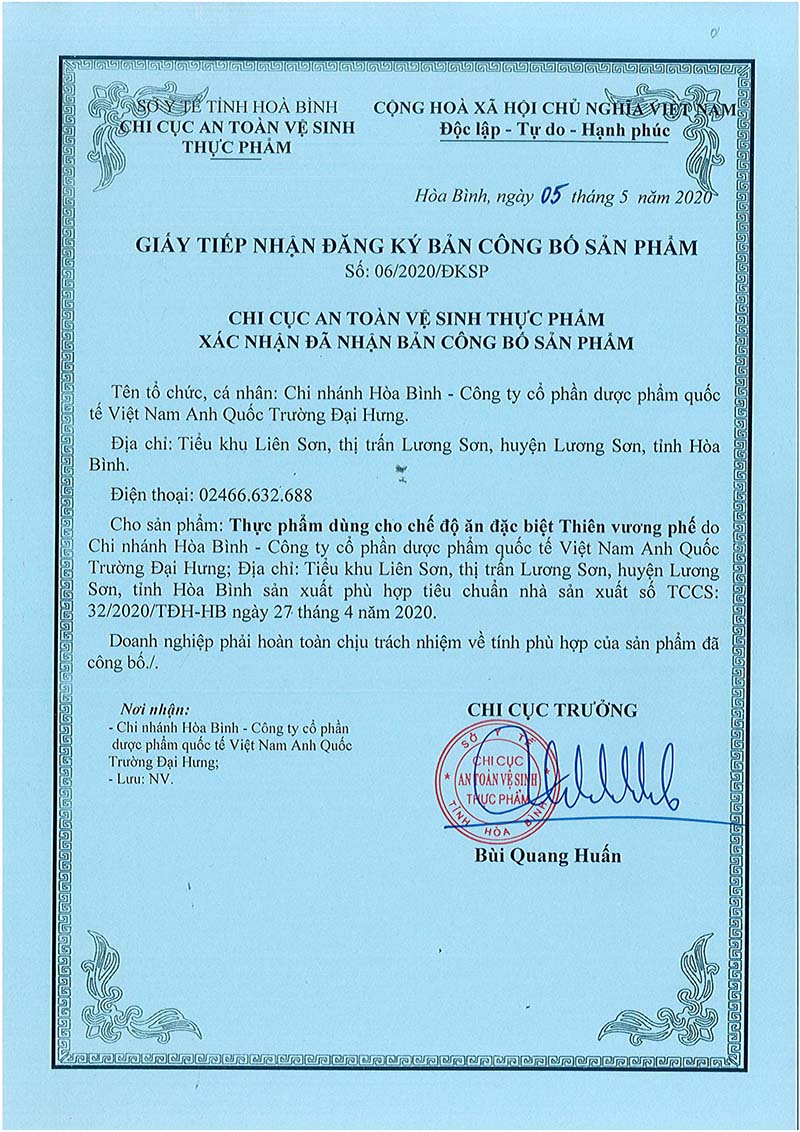 Hình ảnh: Giấy chứng nhận công bố sản phẩm Siro ho Thiên Vương Phế