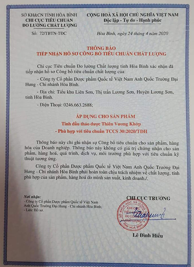 Hình ảnh: Giấy chứng nhận công bố sản phẩm Tinh dầu thảo dược Thiên Vương Khớp