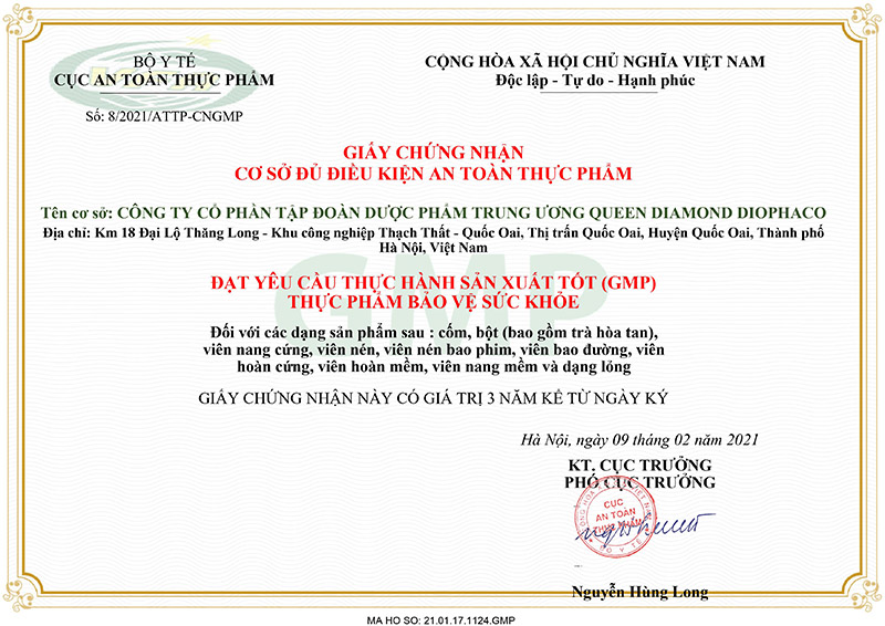 – Được sản xuất bởi nhà máy DIOPHACO đạt tiêu chuẩn GMP, được chứng nhận đủ điều kiện an toàn thực phẩm dành cho người sử dụng.