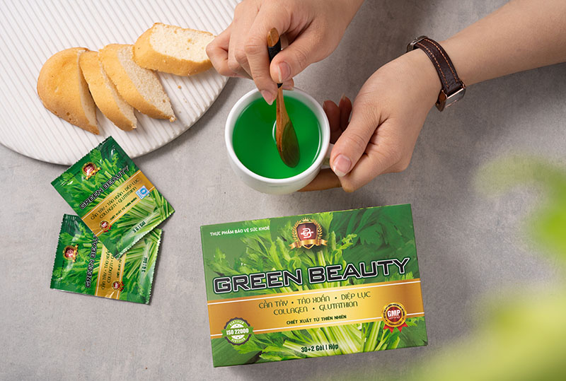 Đặc biệt hơn bên cạnh thành phần chính là tinh chất cần tây tươi nguyên chất, GREEN BEAUTY vị lá nếp còn có sự kết hợp thêm từ các hoạt chất tốt khác như: Collagen, Tảo Xoắn, Diệp Lục và Glutathione có lợi cho sức khỏe, sắc đẹp, hỗ trợ thanh lọc, loại bỏ mỡ thừa tự nhiên.